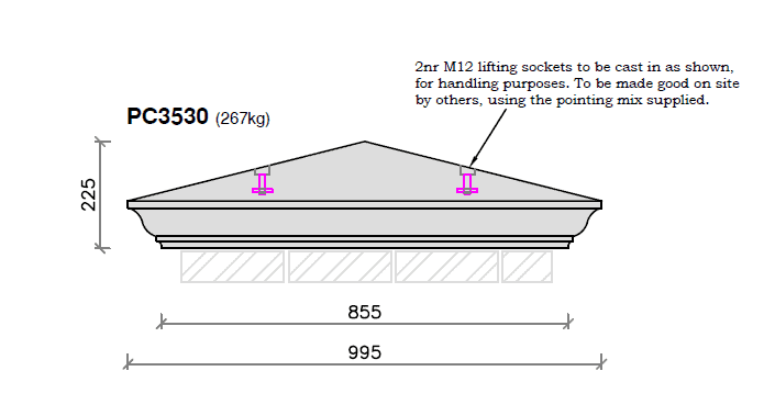 This item is cast with two M12 lifting sockets in the top face to allow for safe handling in our factory, colour matched pointing mix will be included with your order so you can fill the sockets after installation. We are unable to supply the lifting loops, but they are readily available from many stores
