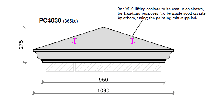This item is cast with two M12 lifting sockets in the top face to allow for safe handling in our factory, colour matched pointing mix will be included with your order so you can fill the sockets after installation. We are unable to supply the lifting loops, but they are readily available from many stores